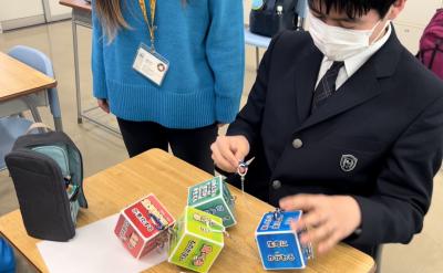 続いて、埼玉県総合教育センターからお持ちいただいた「貧困キューブ」や文字が読めないことの困難を体験する標識や薬のサンプルを使って、生徒が実際に体験をしてみます。
