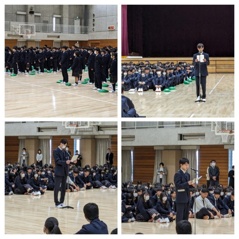 在校生が待ち迎える中、1年生が入場し、1年生の代表が心構えを発表しました。その後、在校生を代表し生徒会長が、新入生を迎えるメッセージを発表しました。