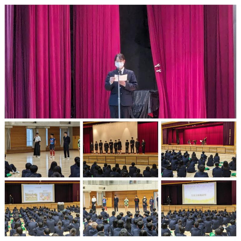 その後第2校時は、生徒会入会式です。生徒会執行部により、学校行事の紹介、高校生活の過ごし方などについて、パワーポイントを使って説明がありました。その後、各部から各部の活動内容の報告があり、吹奏楽部・チアダンス部の活動が舞台の上で披露されました。
