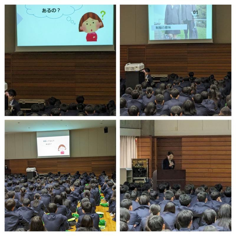 今日の1年生は、終日オリエンテーションです。第5校時は、外部から講師をお迎えし、制服セミナーでした。制服にはどういう意味があるのか、どのように着こなしてほしいか、などといった内容を、お話ししていただきました。