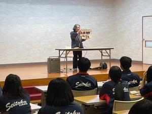 普段、じっくりと向き合うことのない演劇の世界に刺激を受けたようです。終了後、生徒同士で感想を話しながら会場を後にしました。