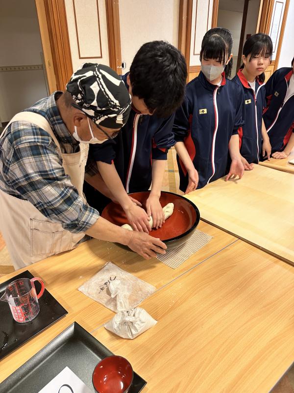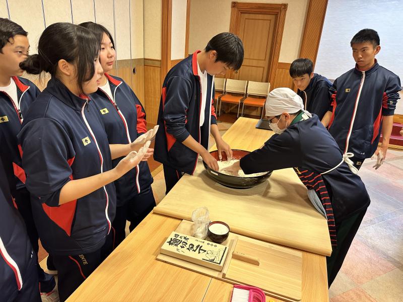朝食の後は、蕎麦打ち体験。初めての体験で、みんな興味津々です。