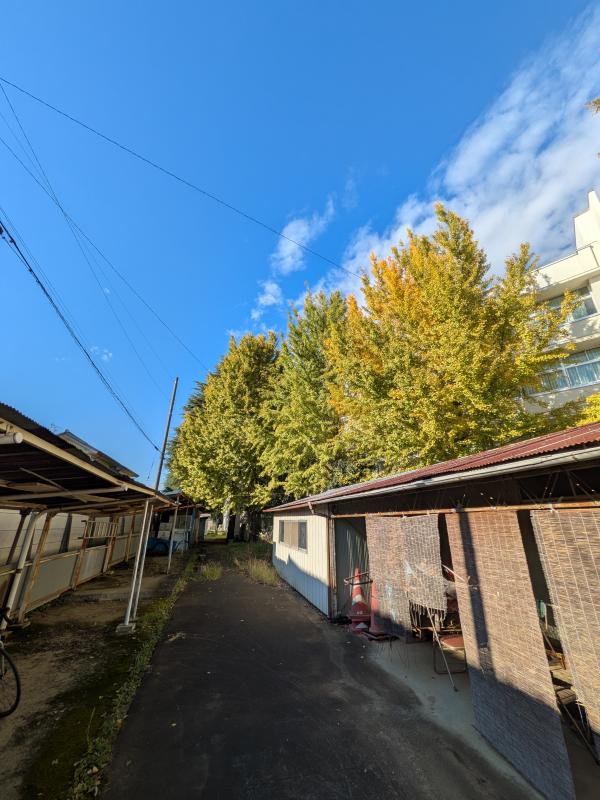 朝の陽ざしが紅葉で色づいた木々を照らし、青空に映えます。