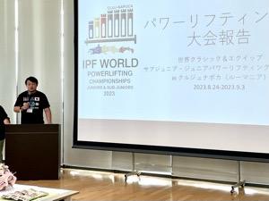 次に桐の会会長と学校長から挨拶があり、その後世界大会に出場したパワーリフティング部から大会の報告がありました。