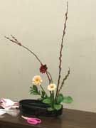 ウンリュウ柳のウネウネした枝に戸惑い、苦戦しつつ、なんとか活け終わりました。小菊は白、チューリップは薄紫と、前回とはまた一味違った風味になりました。