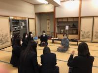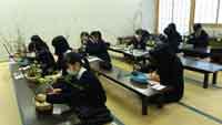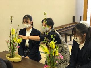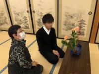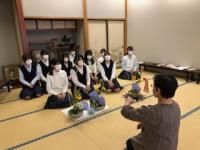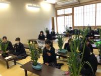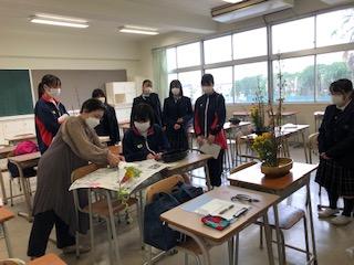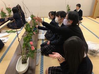 活け終えた後、1年生は2年生の盛り花の、2年生は1年生の盛り花の講評を、先生に型を教わりながら、それぞれやってみました。慣れないことなので、「もっと○○した方がいいと思います」なんてことはとても言えず、「結構です」のオンパレードになってしましたが、こういうことも一つひとつ覚えていくことが大切だと思います。