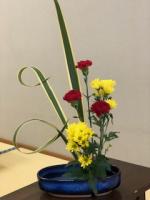 年が改まって1回目、引き締まった空気が部屋を満たしていました…ということはありませんでしたが、みな落ち着いた雰囲気の中で活けました。菊の黄色と千両の赤が、新春らしさを演出してくれたおかげで、新年の寿ぎにふさわしい作品に仕上がったように思います。