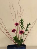 今回の花材は、ユキヤナギ・リンドウ・ガーベラです。ガーベラは何度か活けたことがありますが、今回の色は初めてだったので、これまでとはまたひと味違った感じになりました。