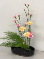 さて、今日の花材はアレカヤシ・カーネーション・スターチス、比較的活けやすいものでした。だから新入生が見られてもまったく問題なく(?)活けることができました。先生からは「みまさん、うまく活けられたんじゃないかしら」とのお言葉も頂戴しました。よかった、よかった。