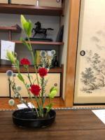 花材は、アワ、ルリ玉アザミ、カーネーションです。少し難しい花材でしたが、先生の指導をよく聞いて、バランスよく活けていました。今の段階はとにかく先生が示したお手本どおりに活ける、これに限ります。