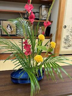 気温の高い日が続き、夏の名残がまだまだ感じられますが、花材の方もロベ・グラジオラスと夏っぽい花材がお花屋さんから届きました。いつもなら葉物の丈を一番高くするのですが、今日は葉物のロベよりグラジオラスを高くして活けてみました。まだ基本を覚えている段階なので、こういう活け方は新鮮です。先生からは華道、いけ花、アレンジメントの違いについても教えていただき、「花」の見せ方の幅広さを知りました。