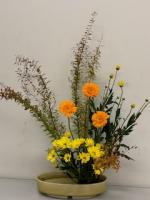 さて、今日(11月19日)は黄色を中心にした花材が届きました。雪柳は葉が少し色づいていて、晩秋を感じさせるものでしたが、ガーベラとスプレーマムは鮮やかな黄色の花を咲かせており、おもしろい組み合わせとなりました。黄色と言ってももちろん草花によって微妙に色合いは異なります。そうした色の妙も味わいながら活けてみました。