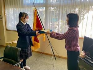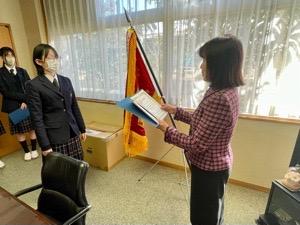 本日、昼休みの時間、1・2年生第3学期ホームルーム委員長・副委員長の、辞令交付がありました。校長先生から辞令をいただき、ホームルーム委員としての心構えを話していただきました。