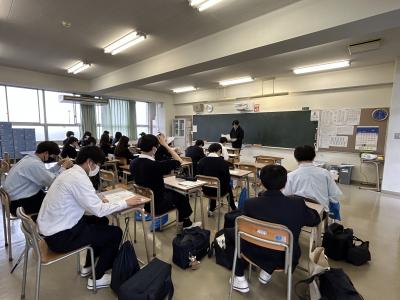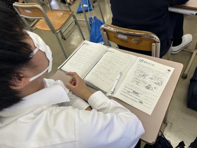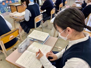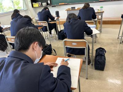 本校では、8時35分から45分までの10分間で朝学習に取り組んでいます。今回は1年生の進学選抜コースの英単語学習の様子を紹介します。