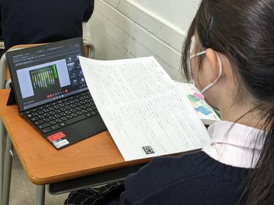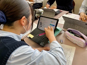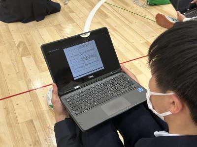 また、これまで生徒総会の議案書は印刷しての配付でしたが、今回PDFで事前に配布し、当日はChromebookを各自持ち込んでの総会となりました。