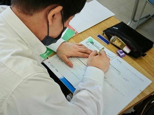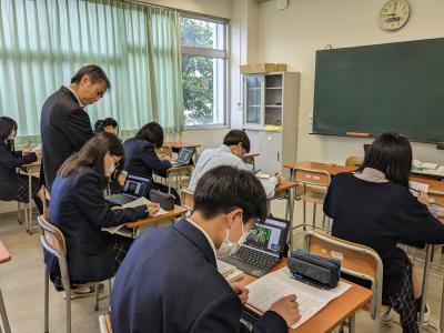 例年、この時期は登校した生徒が、職員室の担任の席の脇に列をなしている風景が見られましたが、今年は少し様変わりです。今年の3年生は全員がChromebookを持っています。そのため、担任はGoogleClassroomを使って、オンラインでの添削指導となりました。