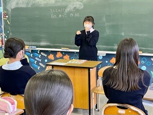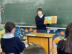 写真は深谷幼稚園での大型絵本の読み聞かせの様子です。