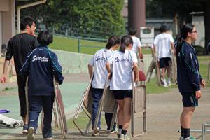 準備の担当になっている部活動,委員会の生徒がテント設営,用具の運び出しやライン引きなどの準備を