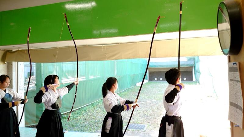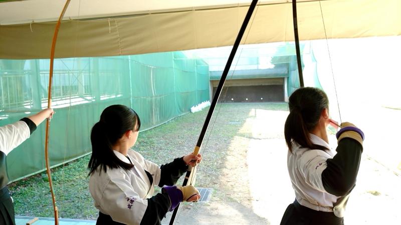 朝は気温がとても低く、部員たちも寒さに耐えながらストレッチをしていましたが、弓を引くにしたがって体が温まってきたようです。