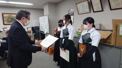 中学2年の庄司が高校生に交じって3位に入り,賞状と賞品を受け取りました。