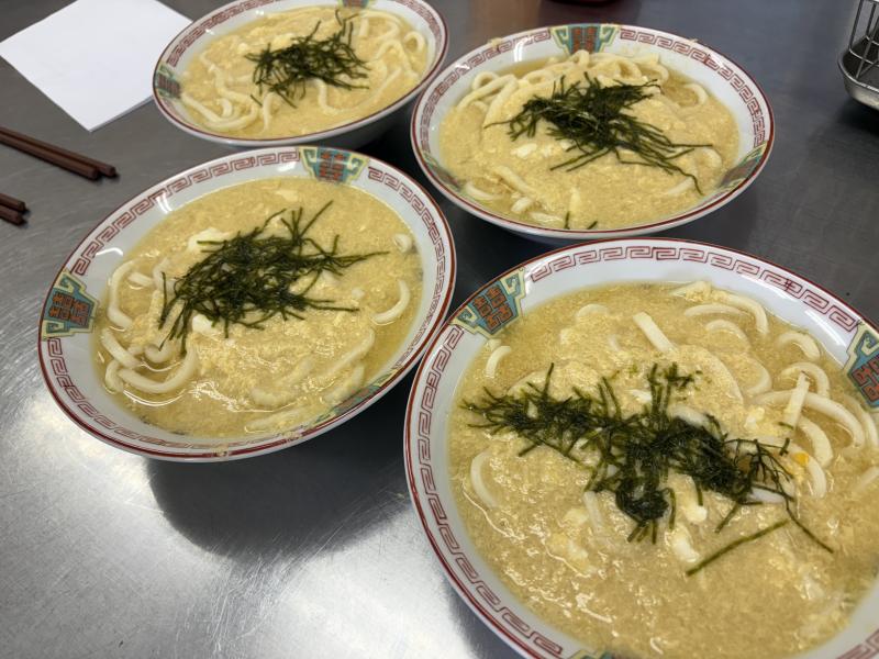 今回は卵とうどんを使うことを条件に各班で用意したレシピで調理しました。