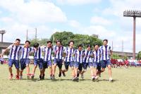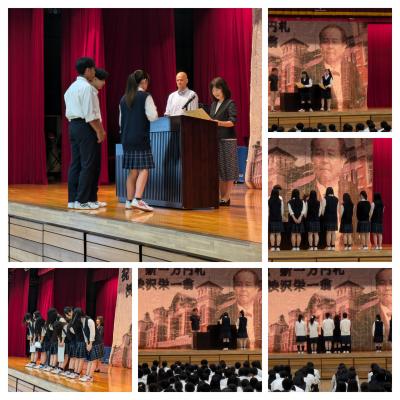 ようやく今学期も終業式です。全校で作成した、渋沢栄一モザイクアートをバックに校長先生から式辞をいただいた後、各部活動の試合の結果を表彰しました。