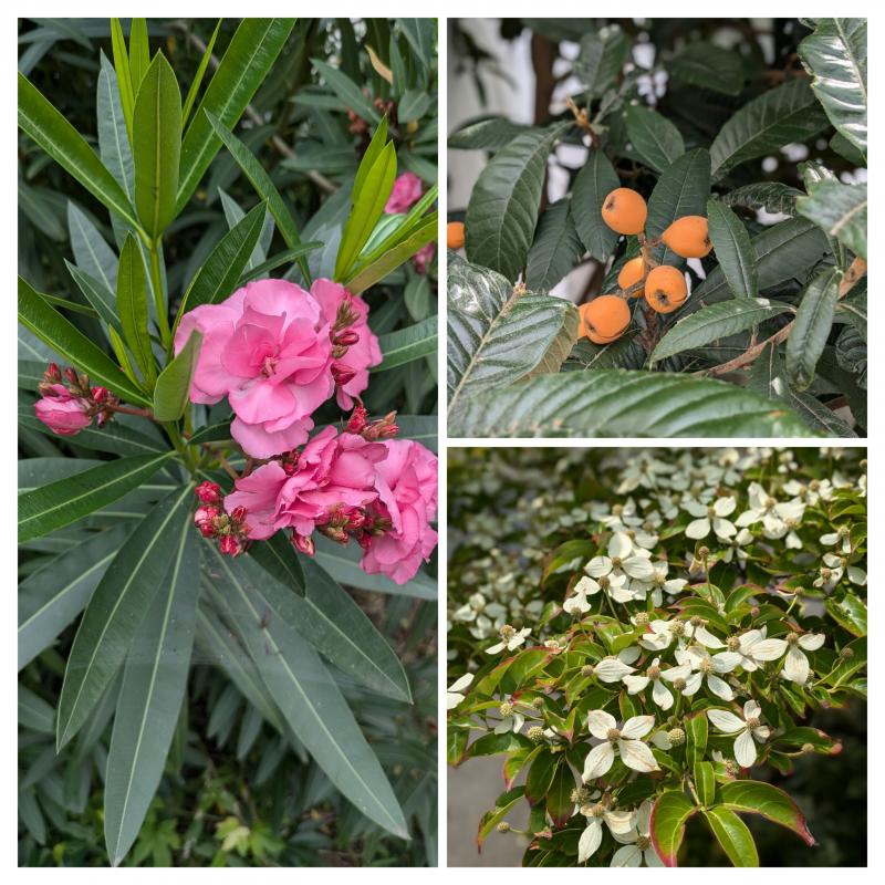 一緒に写真に写ったのは、赤い花が夏の花の夾竹桃(きょうちくとう)、白い花はヤマボウシ。