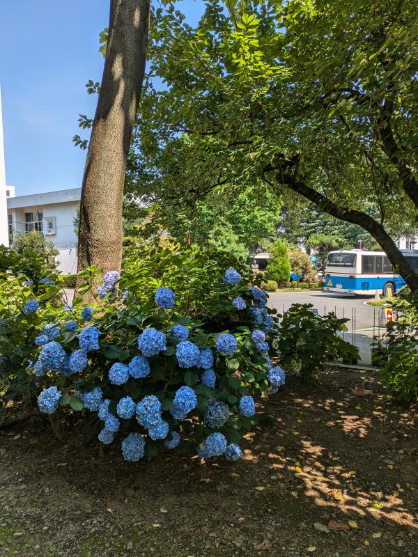 この時期の花と言えば、「アジサイ」ですが、少し色の変わったアジサイが校内にありました。