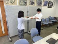 まずは柔剣道場に集まり、面接の心構えや立ち居振る舞いなど、実演もまじえながらわかりやすく説明していただきました。