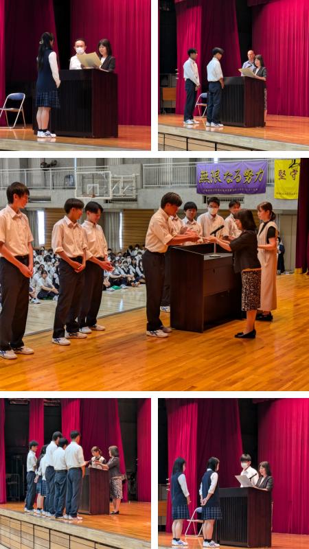 パワーリフティング部・女子バドミントン部・陸上競技部・男女テニス部・中学テニス部・写真部・書道部、それぞれ大会での結果を、全校の前で表彰しました。