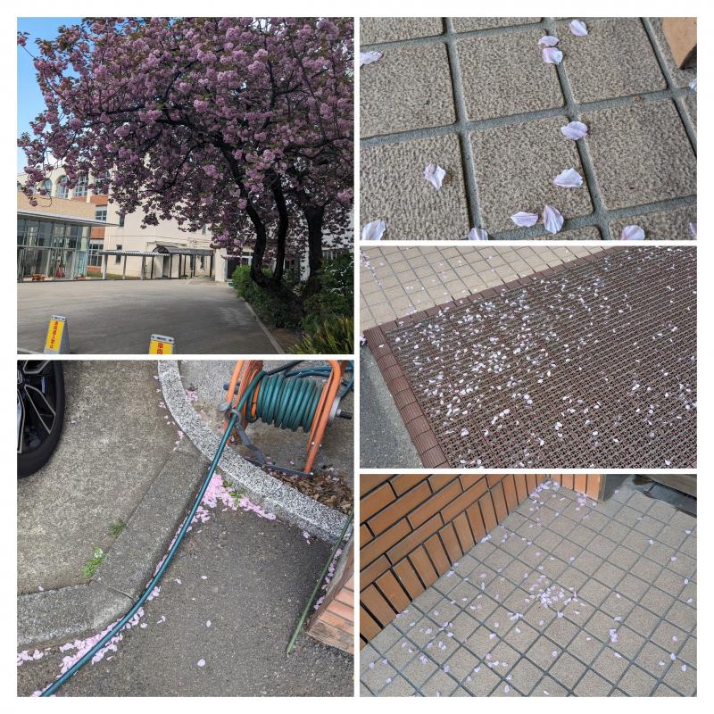 風が強いわけではなかったのですが、この時期、正面玄関は風に舞う花びらに覆われてしまいます。玄関先にある、関山(サトザクラ)のたわわな花房の花びらが風に舞い風流な光景を見せてくれます。中国では花塚を作って落花を埋め、歌を歌う事もあると聞きます(葬花吟)。そんな春ひと時の光景です。