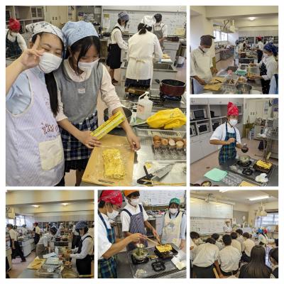 調理実習(1年家庭基礎) 授業 投稿日時 : 2023/09/22 今日の1年生家庭基礎の授業は、調理実習でした。1時間が講義による事前学習、2時間目が実習。 メニューはだし巻き卵と昆布のお味噌汁。各班ごとに、試行錯誤の共同作業です。 “出汁”をしっかりとり、卵がこんがりと焼きあがりました。(少し焦げ目が強い班も・・・) 最後はみんなで楽しく試食です。