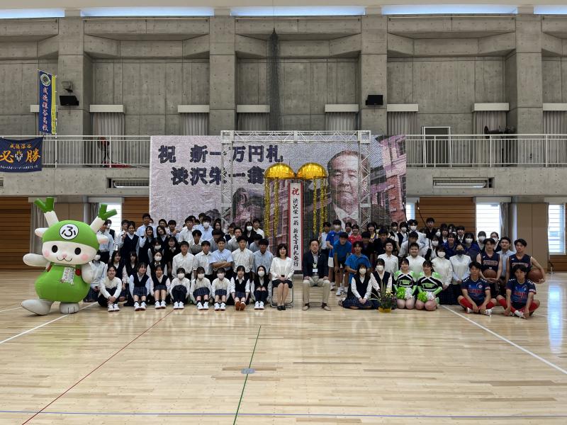 渋沢栄一翁の新一万円札の発行を祝すためにモザイクアートを作成し、今回そのお披露目のために「くす玉開き」を生徒会が企画いたしました。