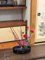 新春最初の活動です。花材の中で際立っていたのはサンゴミズキ。大きく枝を広げて迫力満点です。色も真紅で、カーネーションの赤と相まって、新春の寿(ことほ)いだ雰囲気を醸し出してくれました。