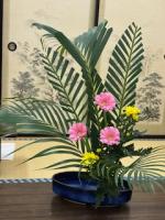 前回のサンゴミズキも大きかったですが、アレカヤシの葉もなかなかの大きさで、部員たちもやや圧倒されていました。生け花だけではないでしょうが、やはりバランスが大事です。アレカヤシの大きさと合うように、他の花材を配しました。