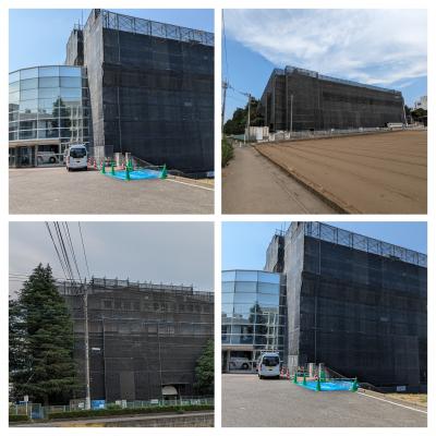 本校Fアリーナ(総合体育館)では、この夏、外装工事をしています。