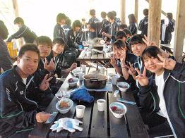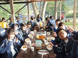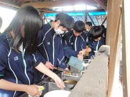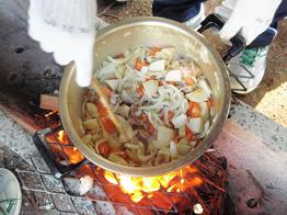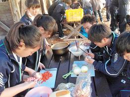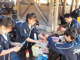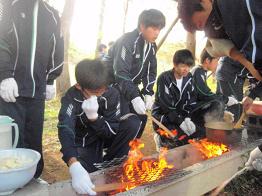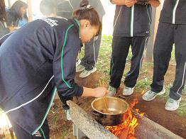 班で協力して,材料を切り,火をおこしカレーを作ります。