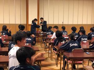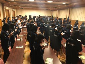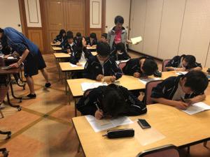 夕食前の研修で校歌を練習し,中学時代の恩師へはがきを書きました。