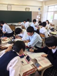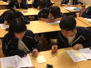 課題監督の先生が「じゃあ始めて」というとサッと班になり、すぐに課題学習がスタートしました。助動詞の意味の識別にやや苦戦気味でしたが、各自で調べたりグループ内で教え合ったりしながらどんどんノートが埋まっていきました。