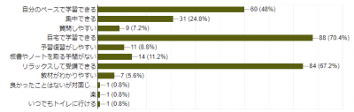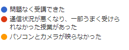 よかった点として回答に多くあげられたものの一つに、「いつもどおり」というものがありました。オンライン授業だからといってふだんと全く違う授業だと、受ける側は戸惑うこともあるかもしれません。また、オンライン授業は一方通行の授業になりやすい面がありますが、チャットも含め、発言の機会が多い授業は高評価を得る傾向にありました。