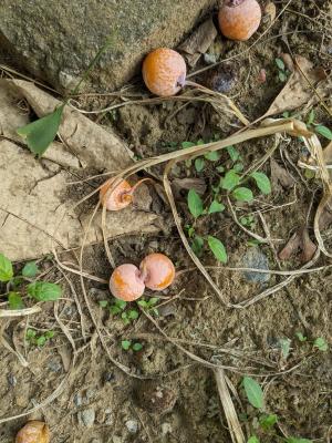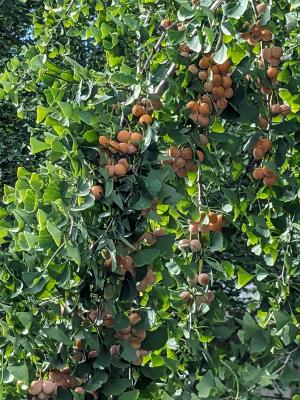 ふと見てみると、枝もたわわに身が実っていることに気づきました。銀杏(ぎんなん)がびっしりと実っていました。実が実る木と、そうでない木があるんですね。