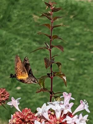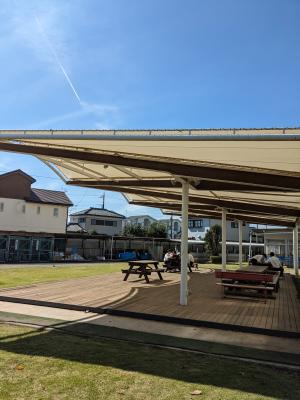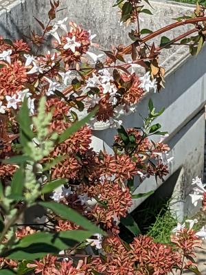 校内は四季様々な草木に彩られています。グランドの給水所の脇に花が咲いていましたので、Googleレンズで検索かけたところ、アベリアとのこと。「アベリア」はなんとなくよく聞く単語で、花の名前という事は知っていました。花としてみるのは、初めてだったかもしれません。虫が蜜を吸いに来ていました。ガーデンテラスでは、生徒がお弁当を食べていました。秋ですね。