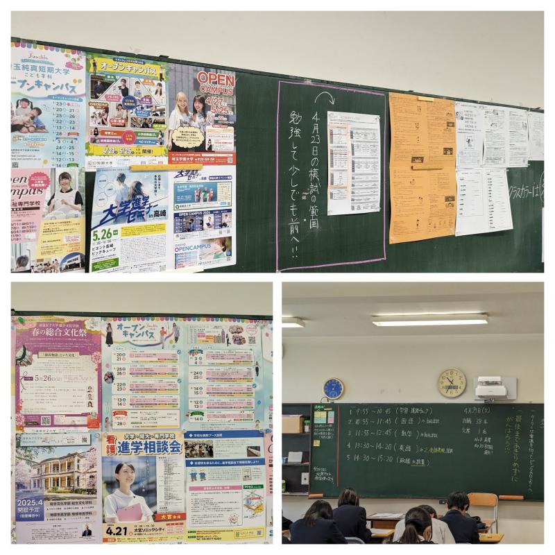 すでに三年生の教室は、進路に向けて、様々な進路先からのリーフレットなどが掲示されていました。
