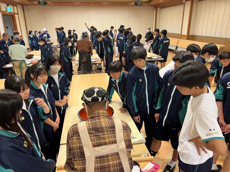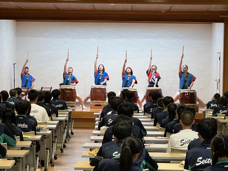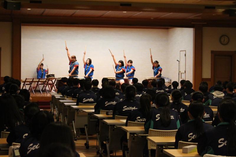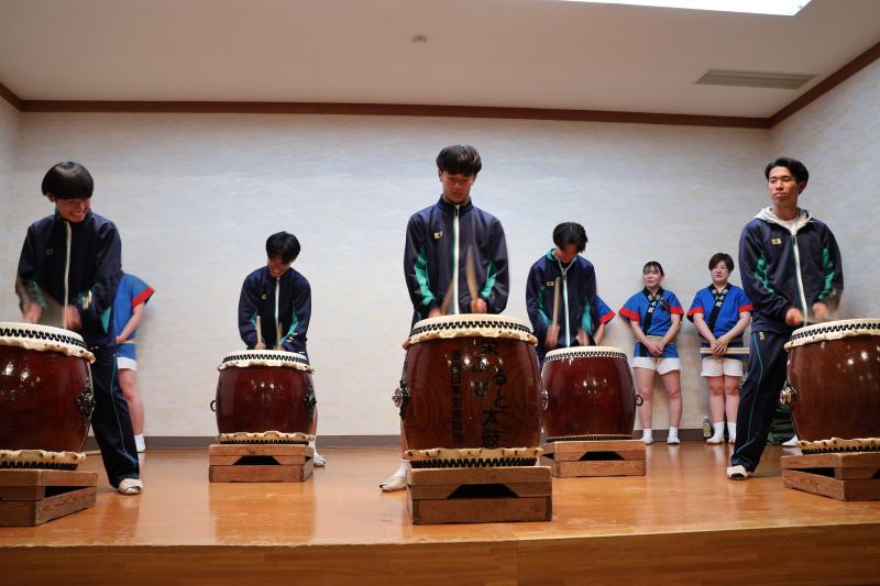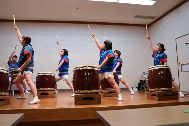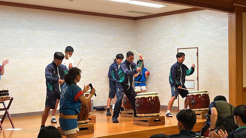 ホテルに戻った後、最後の研修です。榮太鼓鑑賞を行いました。また、太鼓の体験もさせていただきました。