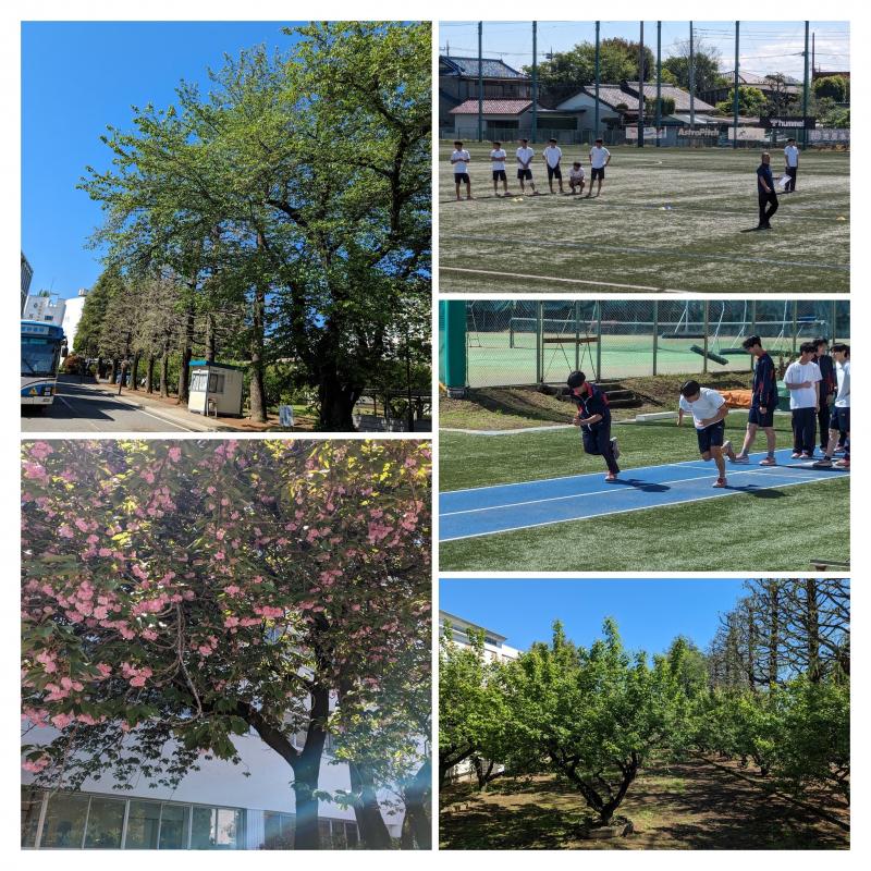 ここ数日のシトシト雨とはうって変わって、からりと晴れました。青空の元、人工芝の校庭では、体育の授業の真っ最中でした。少し前まで、競って花を咲かせていた、梅も桜も今は鮮やかな青葉の頃となりました。