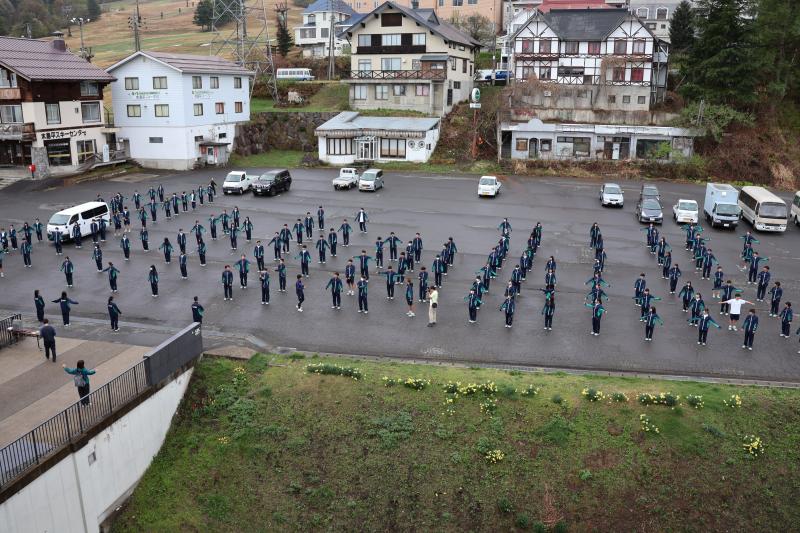 木島平校外学習 2班3日目は朝の集いからスタートしました。誰も遅刻することなく、予定通りにラジオ体操を開始することができました。