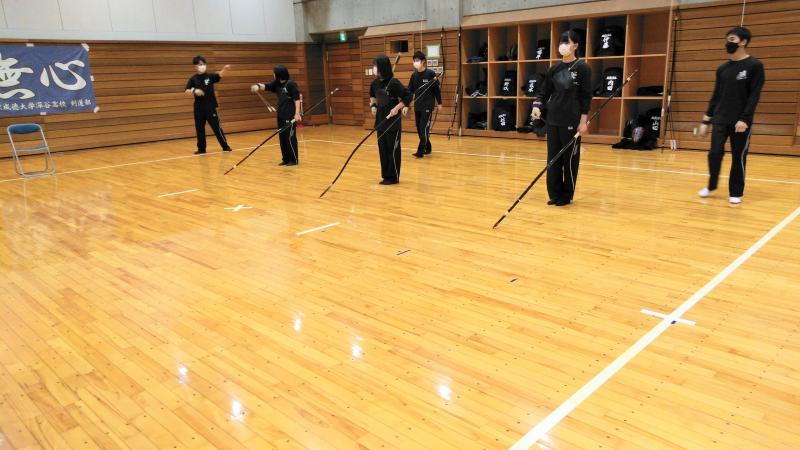 審査に向けて、部員たちは剣道場などを借りて体配(所作)の稽古に励んでいました。