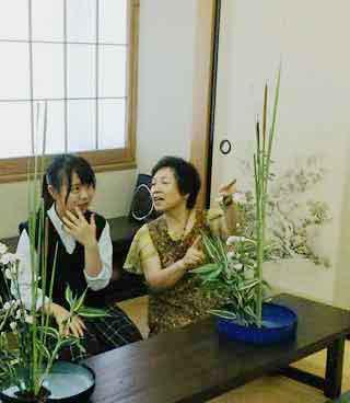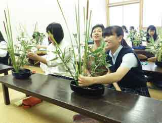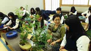 今日は活けている最中に、あちこちから「痛(イタ)!」という声が・・・。というのも花材の中にアザミがあったからなんです。アザミの葉にはトゲがあり、これが結構痛いのをご存じの方も多いかと思いますが、ウチの部員の中にはそのことを知らない者もいて、不用意にトゲに触れてビックリしてました。二度三度とやられて「なに、まったく・・・」と花にブツブツ文句を言っている生徒もいました。