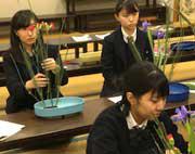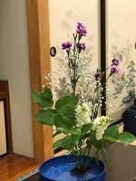 本日の花材の中心はアイリスです。アイリスはアヤメ属の総称で、紫、青、オレンジ、白、ピンクなど様々な色の花があります。今回私たちが活けたのは写真でおわかりのように紫です。アヤメというと六月のイメージですが、この時期でも普通にあるんですね。